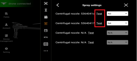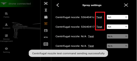 8. Click the "Test" function option next to the centrifugal nozzle number at the top, and the system will issue a test command to the centrifugal nozzle.