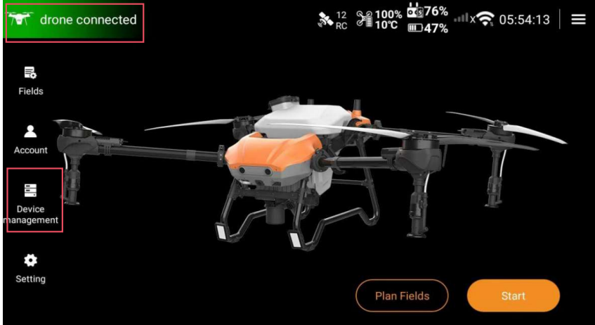 Drone Connection: Short press and then long press the power button on the drone to turn it on. Open the Huida Drone App, locate “Device management” on the app’s main interface, and enter it.