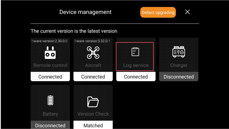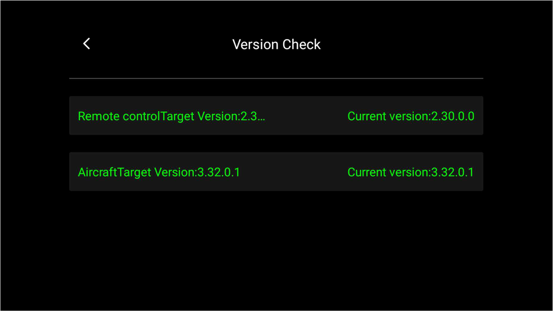On the “Version check” interface, you can view the current version numbers. When the drone and remote control versions match, the text will be highlighted in green.