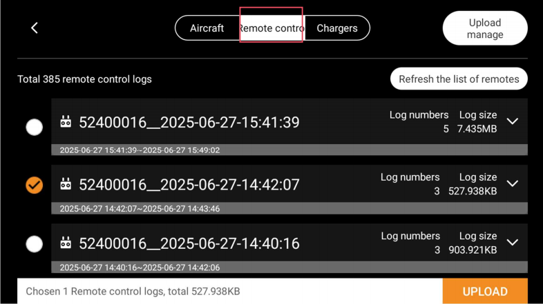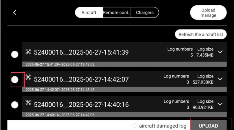 4. Select the log files you wish to upload from the list. You can select files by tapping the checkboxes next to each file name. To select multiple log files, tap the checkboxes for each desired file. (A new log file is generated each time the drone is powered on and then shut down. If an issue occurred during the current flight session, make sure to restart the drone to generate a complete log file.)