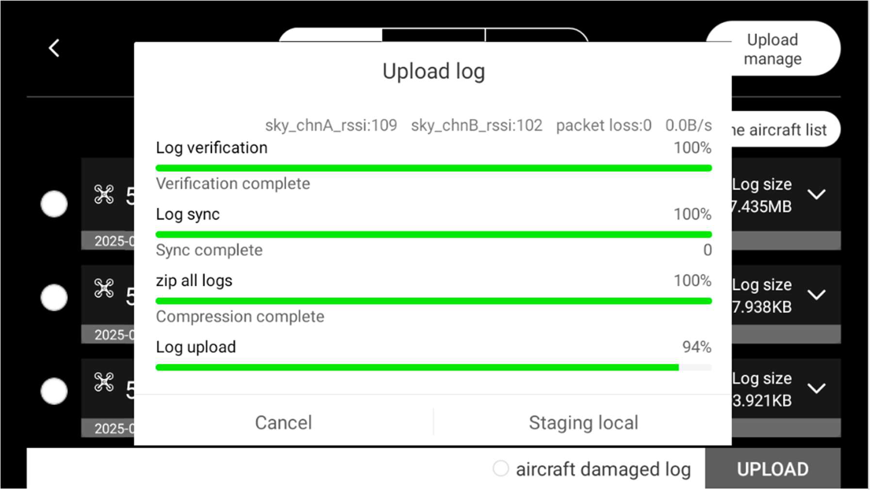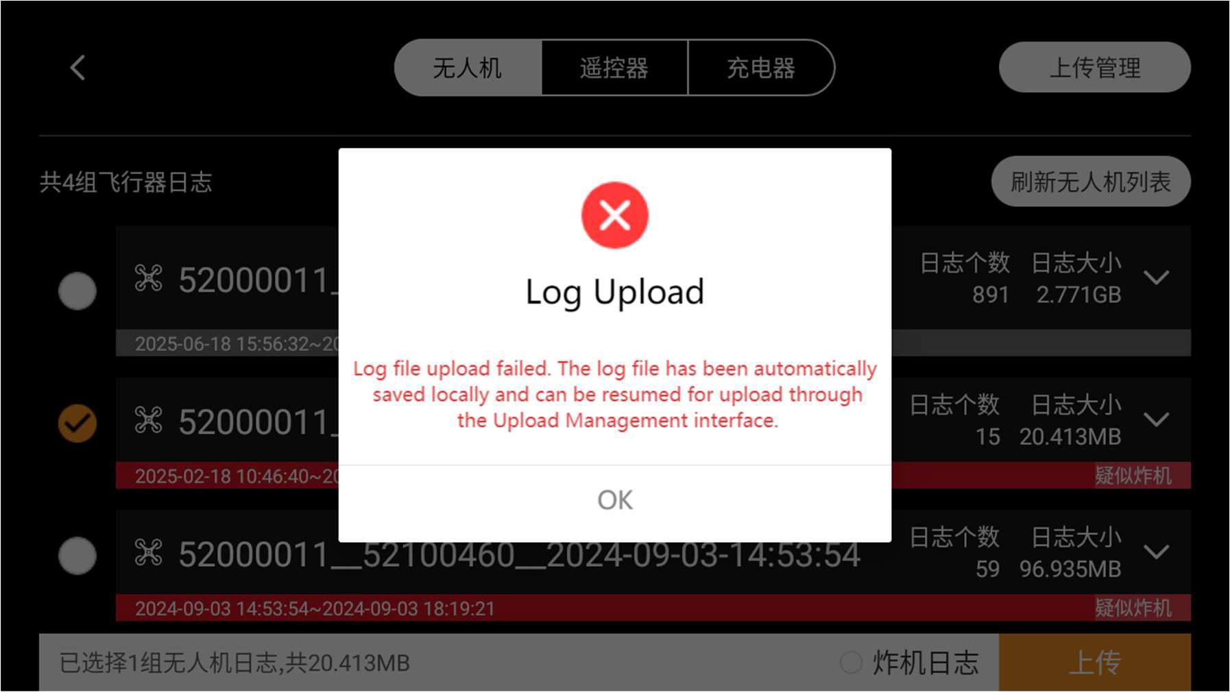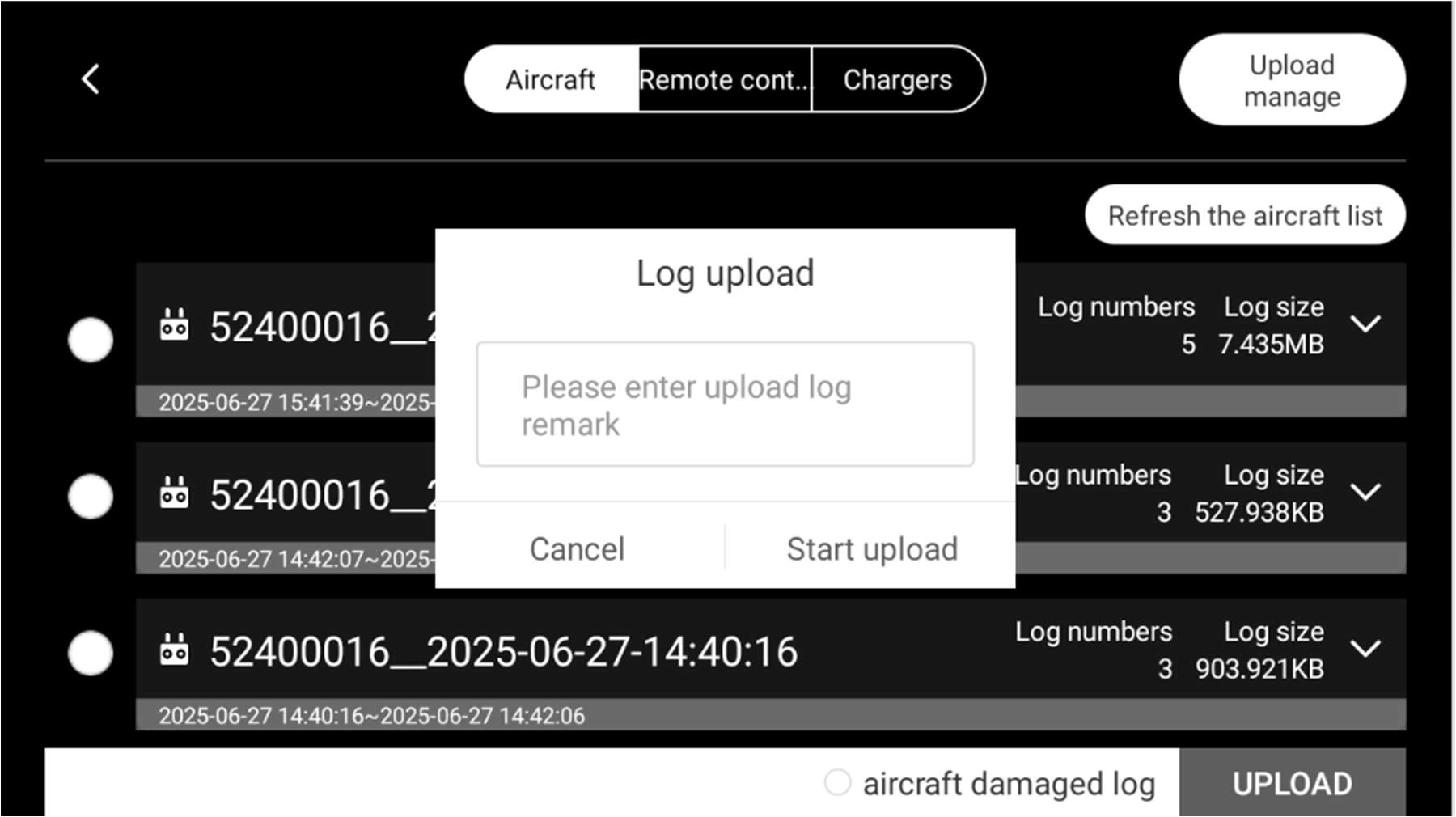 ① Before performing the log upload operation, carefully read the user manuals of both the drone and the remote control to understand the specific operating requirements and safety precautions. Improper operation may result in device damage or data loss.​
