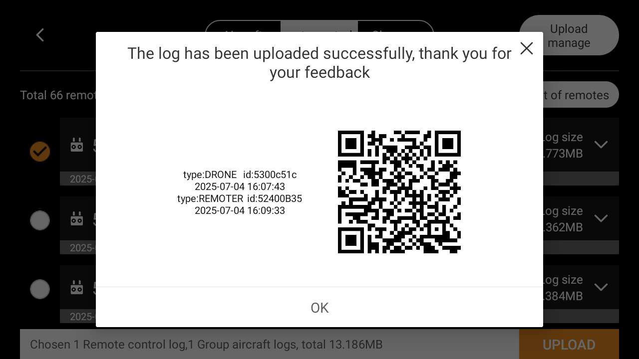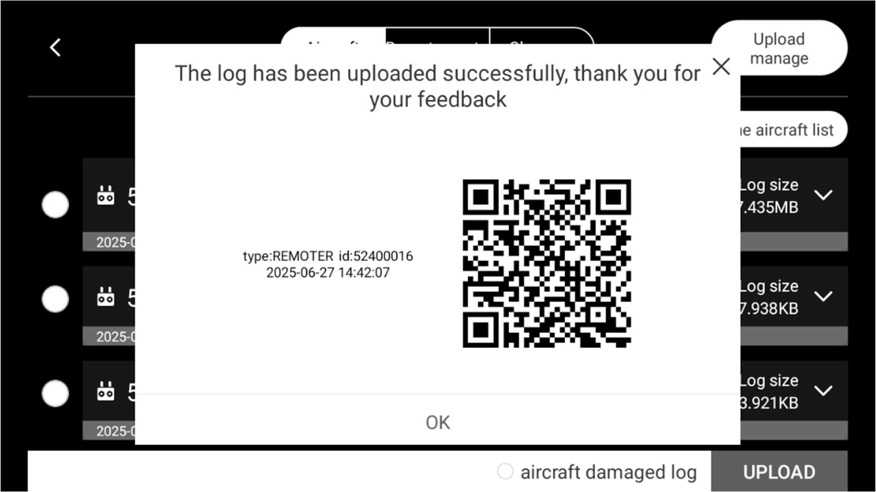 6. Wait for the upload to complete. Once the upload is successful, the app will generate a QR code for the uploaded log. Take a photo of the QR code and send it to the manufacturer's technical support team for further assistance.