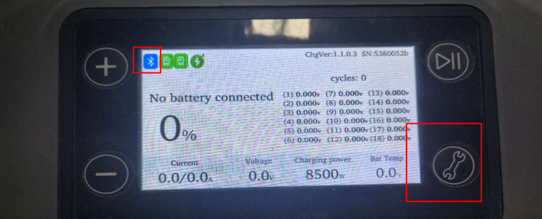 1. The remote controller connects to the charger via Bluetooth. Before uploading logs, make sure Bluetooth is enabled (tap the settings button on the charger to turn on Bluetooth).
