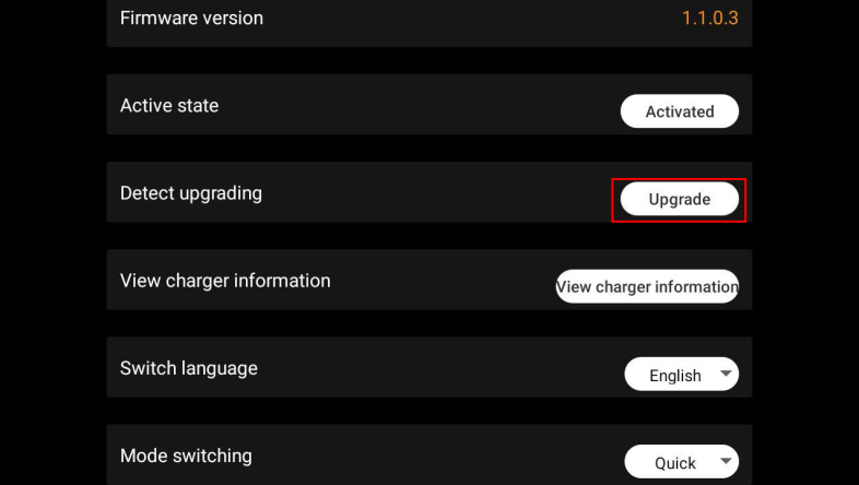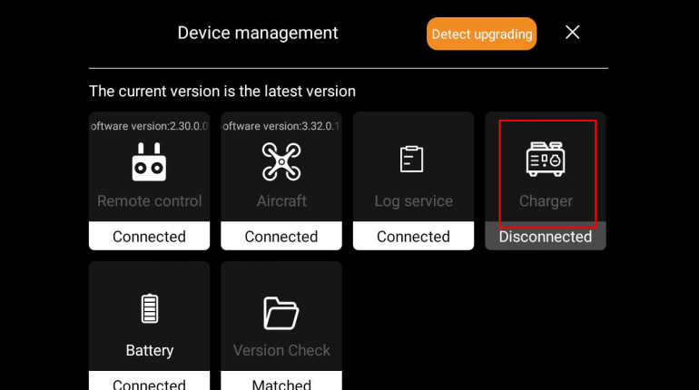 Battery/ Charger Upgrade: In the Device Management screen, tap the “Charger/Battery” icon to enter the Battery/Charger Management interface. In this interface, locate the “Detect upgrading” option and tap the “Update” button.