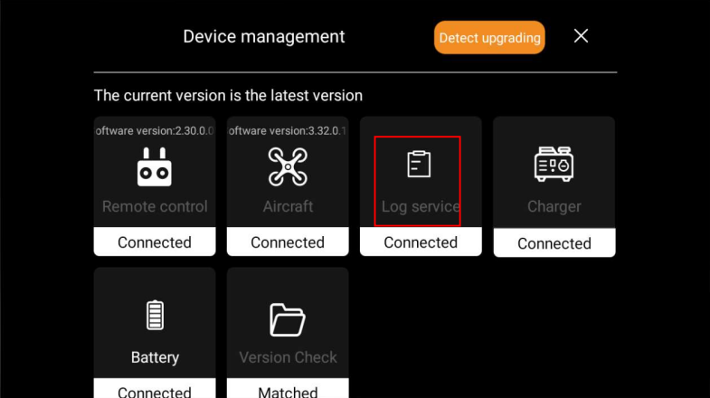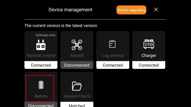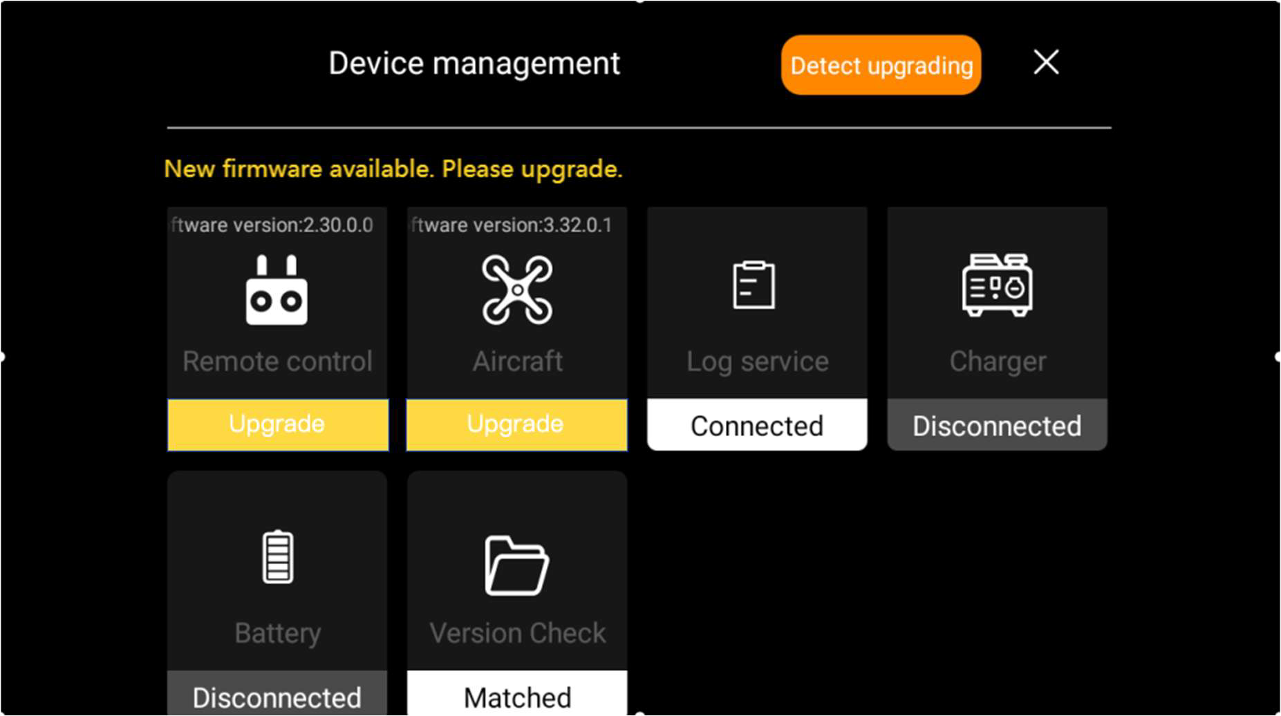 Check firmware version: After the firmware upgrade is completed for both the drone and the remote control, verify the upgrade success by checking the version status in Device Management. A successful upgrade will display the status as “Matched”.