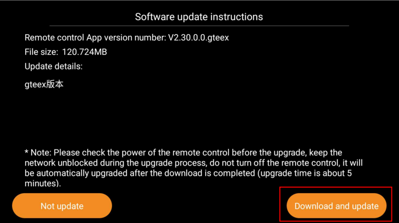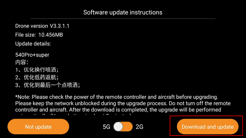 Drone/ Remote Controller Upgrade: When the app prompts that the upgrade for the remote controller or drone is about to begin, carefully verify the upgrade version number, description of the update content, and other relevant information to ensure the upgrade is correct. After confirmation, click “Download and update” to officially start the upgrade process.
