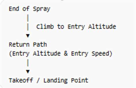 - Return to the takeoff point at the configured entry/exit altitude and speed